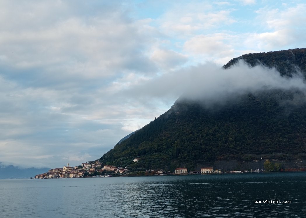 Quelques places de stationnement sur l'embarcadère. À côté de la route côtière donc il y a le bruit de la circulation. Nous avons passé une nuit relativement calme mais réveil à 7h par le camion qui vient ravitailler la barge commerciale qui fait la navette avec l'île d'Iseo. Belle vue sur le lac de Garde et Monte Isola avec de belles couleurs et lumières en début de soirée.