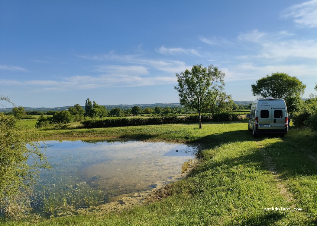 arrêt pour pique nique super vue sur les collines et les champs et des moutons autour d une toute petite marre génial accès facile en camping car