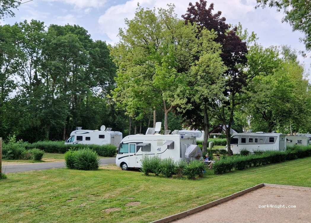 Étape très sympathique et bucolique, juste à côté du centre-ville. La boulangerie est à 2 pas et elle est très bonne. Emplacement large et plate. Top! Attention pour les rabats-joies, l'église sonne toutes les heures; ça ne nous a pas empêché de très bien dormir.