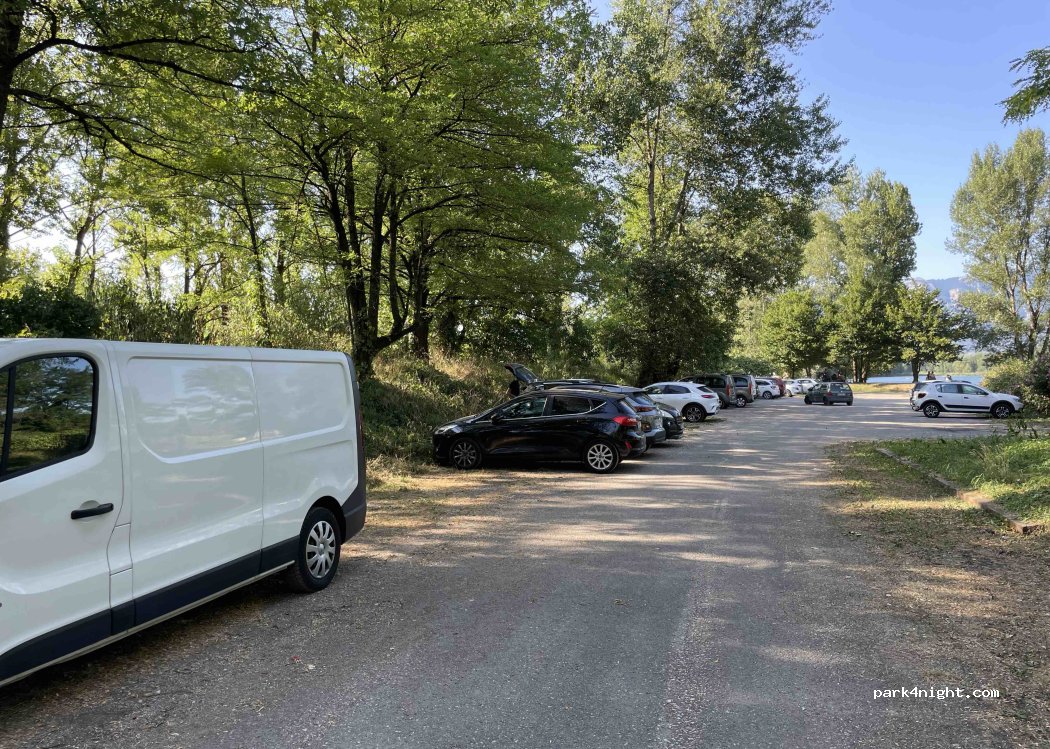 Grand parking ombragé donnant sur le lac. Nous y sommes resté 4 nuits sans problème pour passer le pic de canicule (table de pique-nique, poubelles, eau du lac très propre, sympa pour se baigner) Attention pour rejoindre le spot, Google maps ne donne pas le bon itinéraire ! Il faut passer le village de Pontcharra et arriver par l'est du lac. Vous passez sur une voie ferrée, suivre le panneau "itinéraire conseillé plan d'eau" qui fait prendre une route carrossable sur 200m (maps ne connaît pas ce chemin). Vous arrivez à une petite intersection avec un pont limité à 1m90 sur votre gauche, vous prenez la voie goudronnée à droite qui passe sous les arbres et vous arrivez au bord du lac.