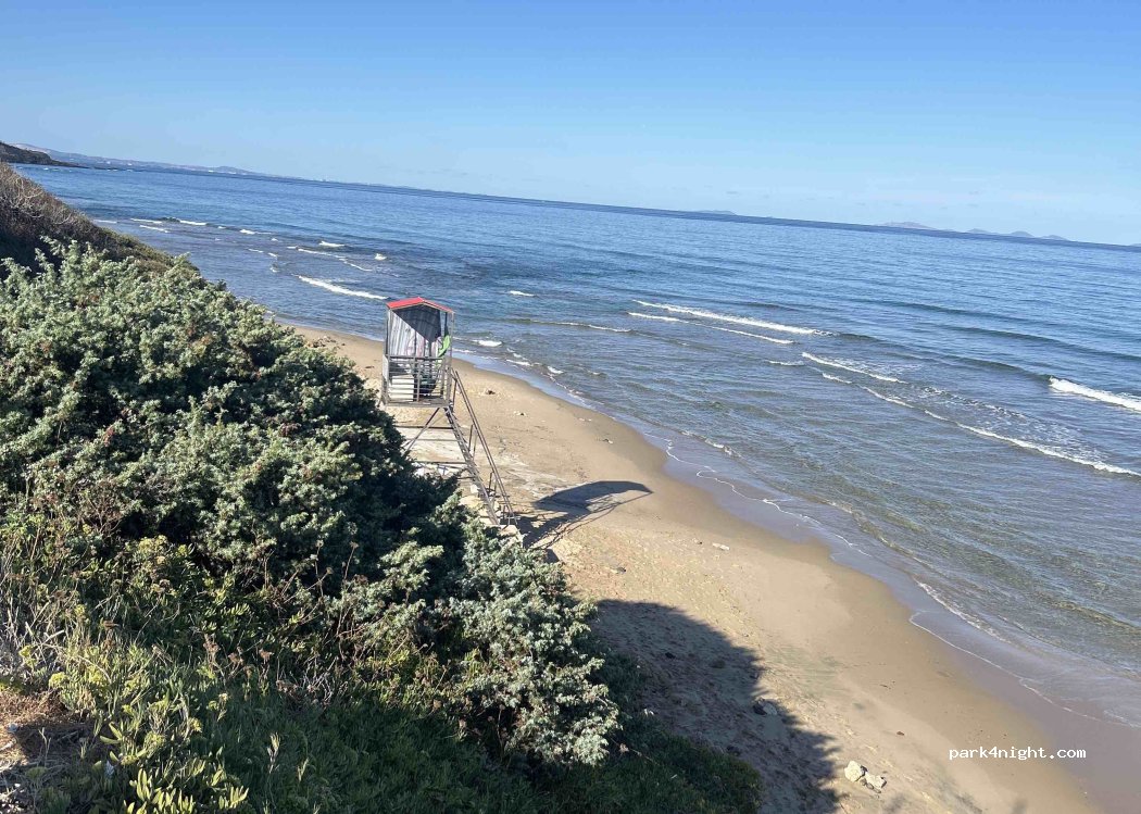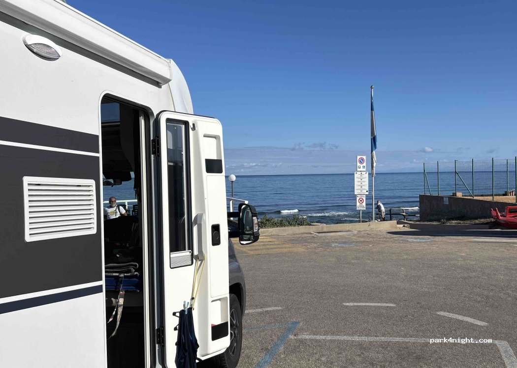 Petit parking calme avec toilettes et douches de plage, superbe vue sur la mer, petit bar et trattoria... Payant de 9h à 20h, gratuit la nuit, plage de sable naturelle... nous étions ici pendant 2 jours, beau sentier de plage au dessus de la côte.