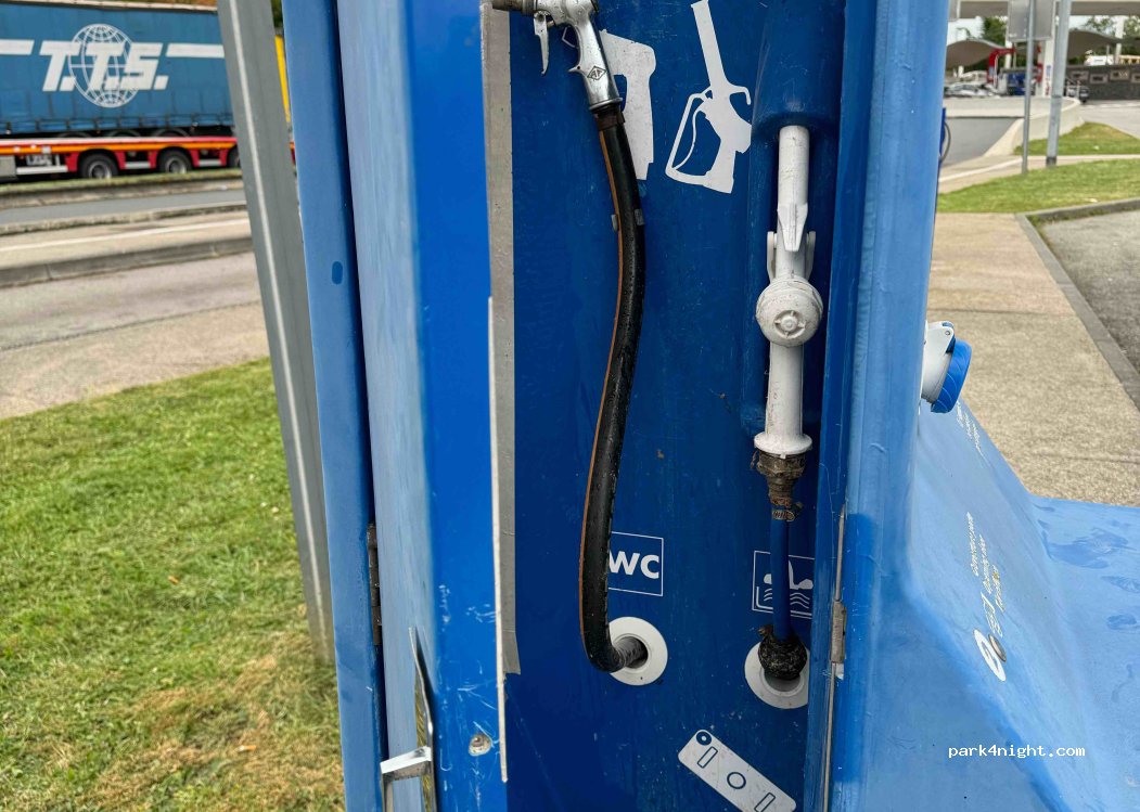 vidange des eaux grises et WC ok, par contre pas d'eau pour nettoyer ou remplir le réservoir. mais belle aire de repos, grand parking pour camping car, choix de cafés et collations à la boutique, toilettes propres