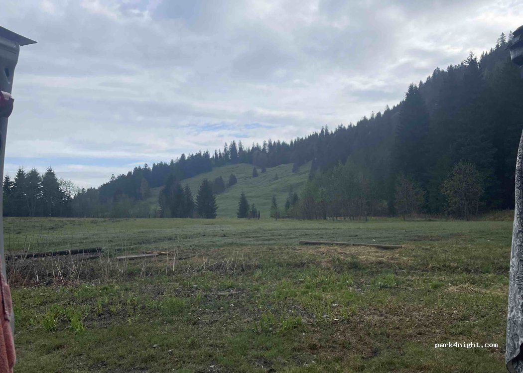 Grand parking entre forêt, montagnes et champs. Au calme. Au milieu des vaches. Nuit sans problème. Un restaurant haut ainsi que le téléphérique (hiver)