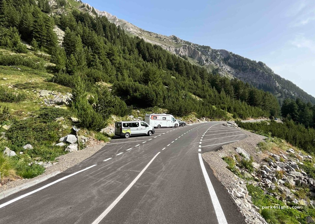 nous nous sommes gares de l'autre côté de la photo sur la partie en dur mais non à plat. venir tard le soir sinon la route est fermée à la montée tout comme le matin après 8h. bien placé pour la balade du sommet.