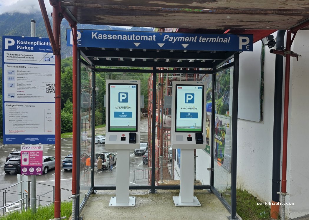 Parkovali jsme zde při návštěvě Dachstein Krippenstein. Vyhrazená místa pro obytná auta i dodávky. Přijeli jsme sem kolem poledne a místa pro větší auta tu stále byla.