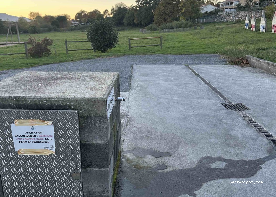 parking réservé camping car goudronné. à cote mairie et espaces verts. poubelles et verre présentes. 2 euros à déposer dans la boite à lettre de la mairie. services eau + vidange + eaux grises gratuites (merci la mairie de n avoir pas coupé l eau des lors qu il ne faisait pas encore froid) attention pour accéder aux services panneau interdiction 3,5 tonnes car manœuvres peuvent etre difficiles