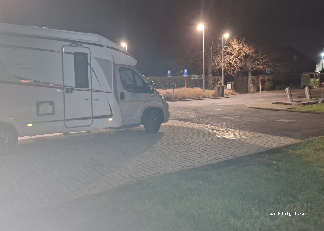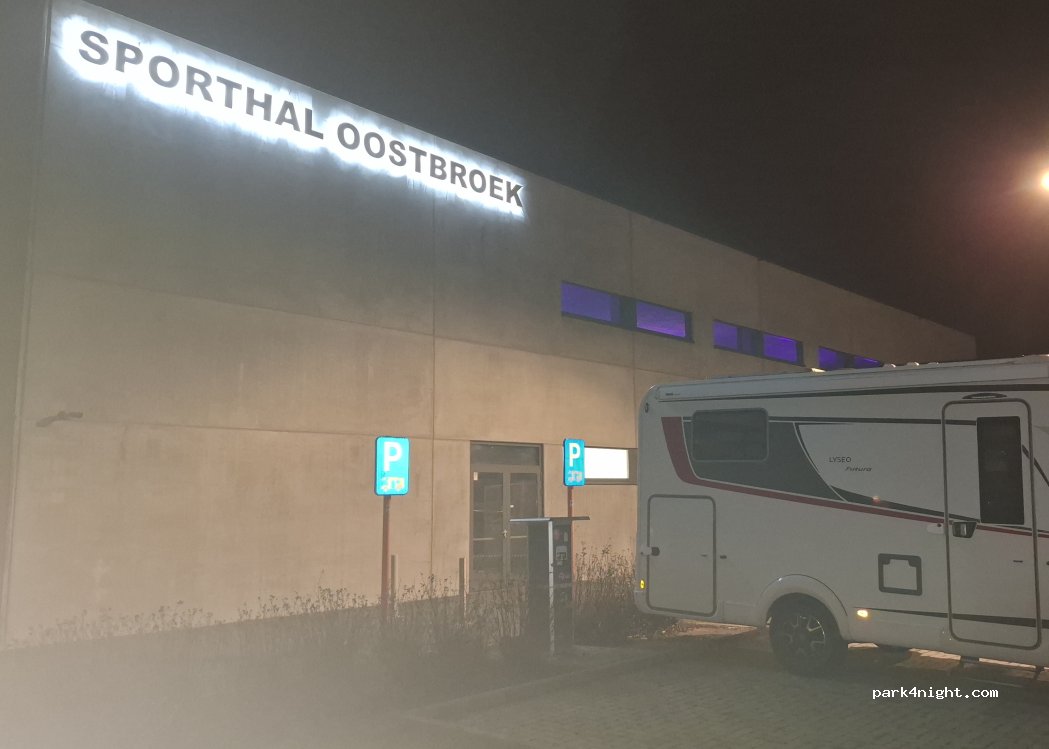 2 voor campers gereserveerde parkeerplaatsen op de parking van de sporthal. Opgelet: rooster grijswater is steeds bereikbaar (midden de baan voor de parkeerplaatsen), maar de septische tank kan enkel geleegd worden (via een darm) als de parkeerplaatsen vrij zijn (aansluiting bevindt zich achter de parkeerplaatsen onder een losliggend dekseltje). Geen vers water voorziening, ook niet voor naspoelen