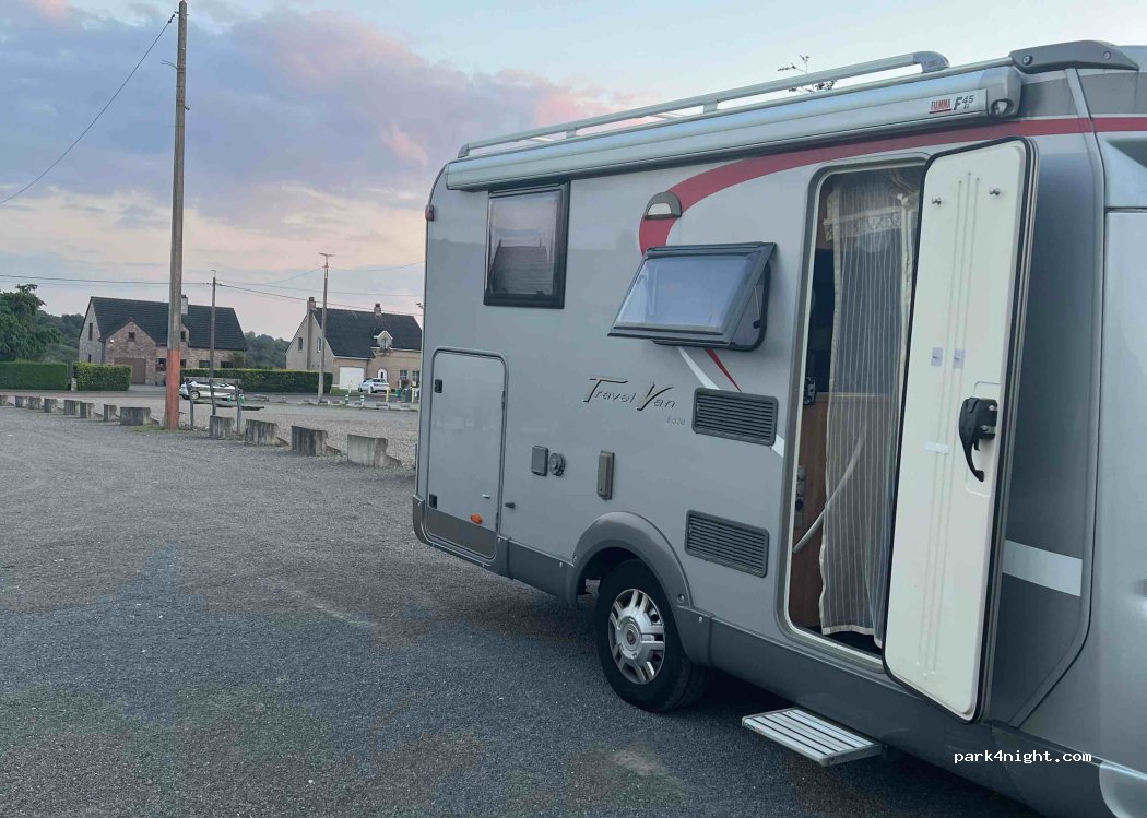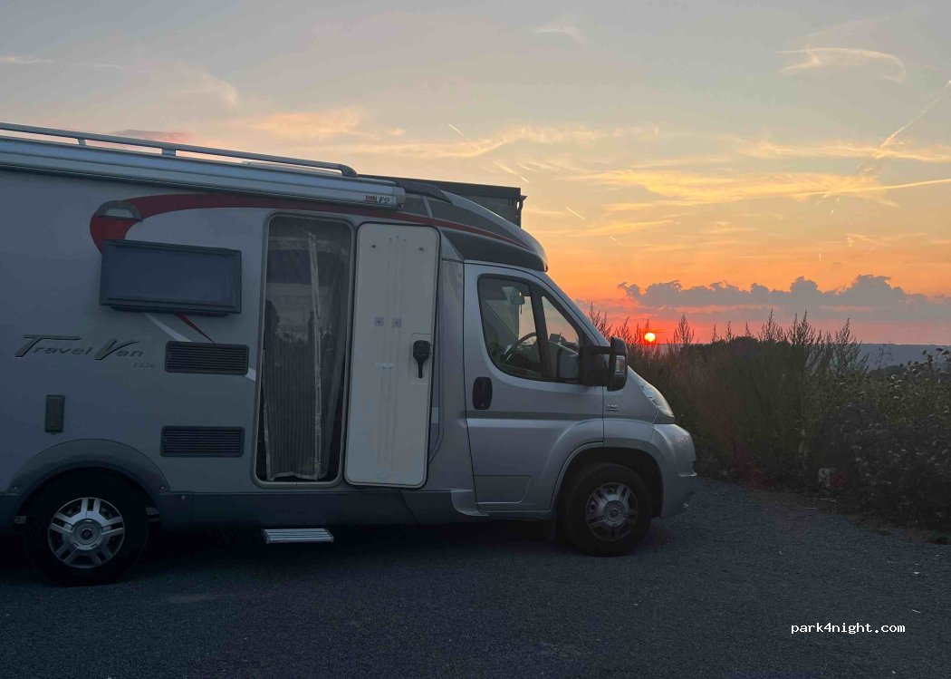 Grote parkeerplaats in rustig dorpje. Geweldig uitzicht met prachtige zonsondergang. S'nachts (vrijdag op zaterdag) tot 4u rondhangende jongeren.