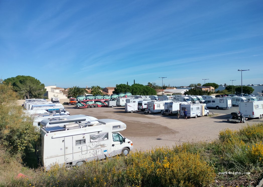 Ne semble plus être possible de se garer là. Avons fait une halte sur parking 200 places plus en retrait du magasin. Idéal pour aller en vélo à Varas Plage où à cette période les cc sont interdits de stationnement. Très bruyant pour la nuit ( musique dans résidence et route départementale ). Sommes allés dormir au stade de Sauvian à qqs kilomètres de là.