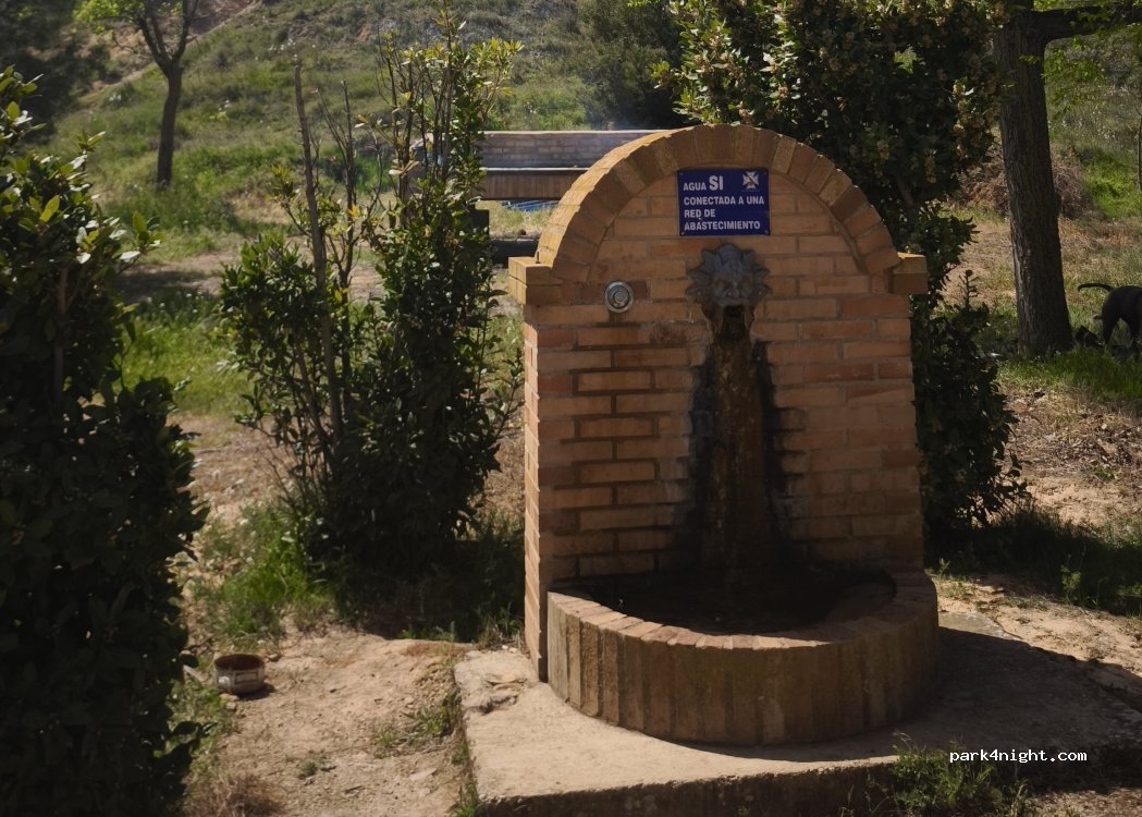 Zona de barbacoas en plena naturaleza, con fuente de agua potable, mesas picnic y sombra.
