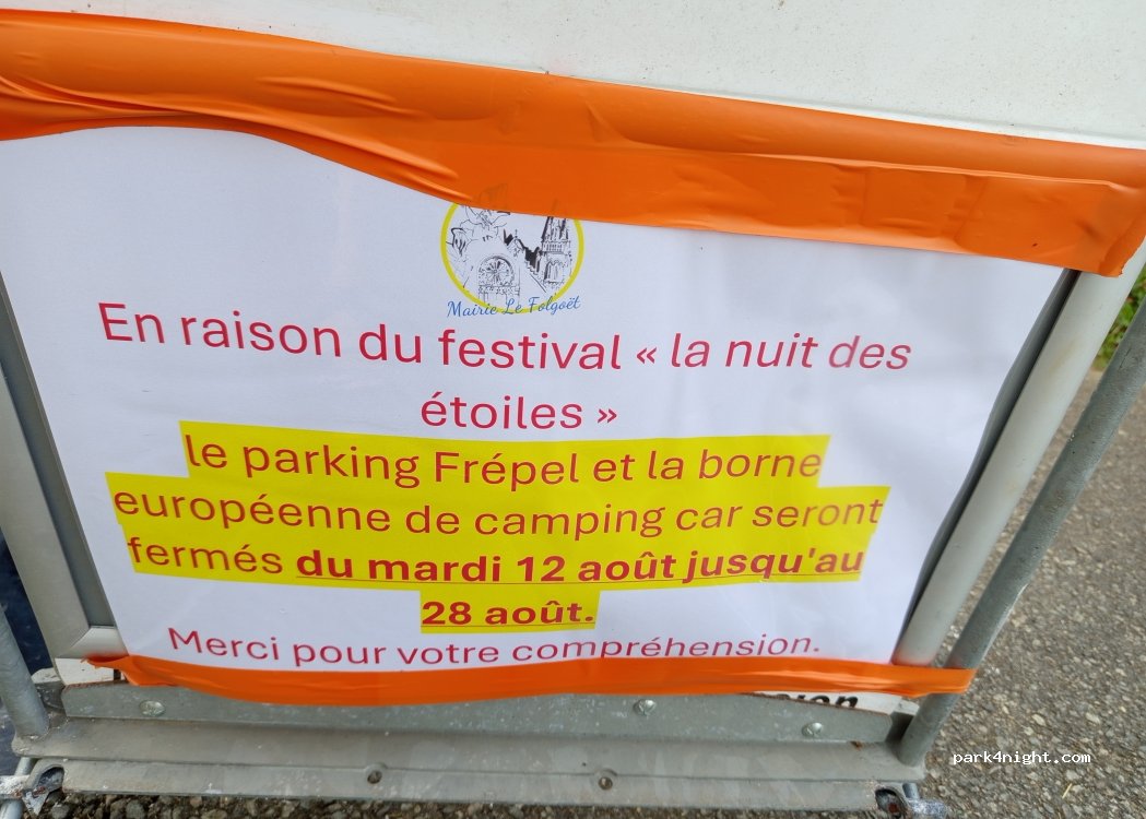 L’aire de camping-car sera fermé du 13 août 8h jusqu’au 16 août 20h . Cordialement la mairie de LE FOLGOËT
