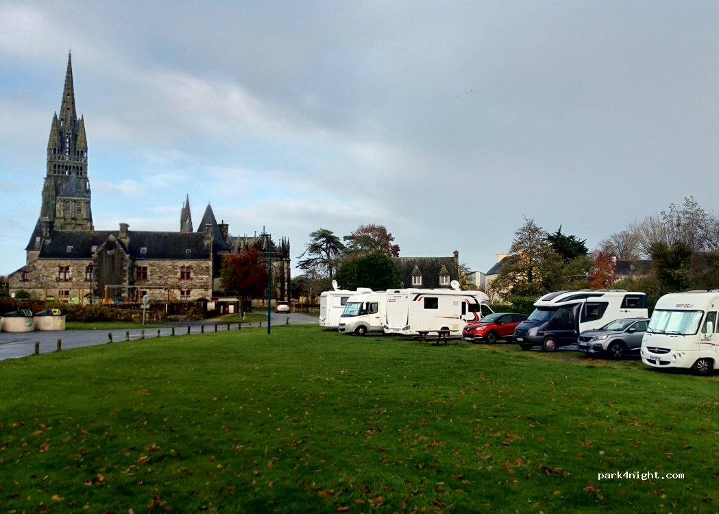 parking spacieux, table de pique-nique, air de jeux, parc wc services eau grise et eaux propres. commerces à proximité. une des plus belles cathédrale de Bretagne. Merci.