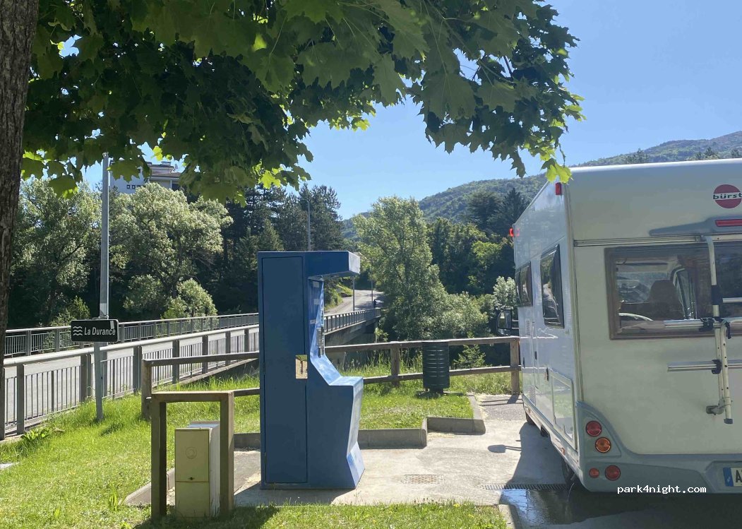 A ce jour la borne est indisponible. Le club de canoë kayak a récupéré les places au bord de la Durance et il n'y a plus qu'un parking à côté des poubelles.