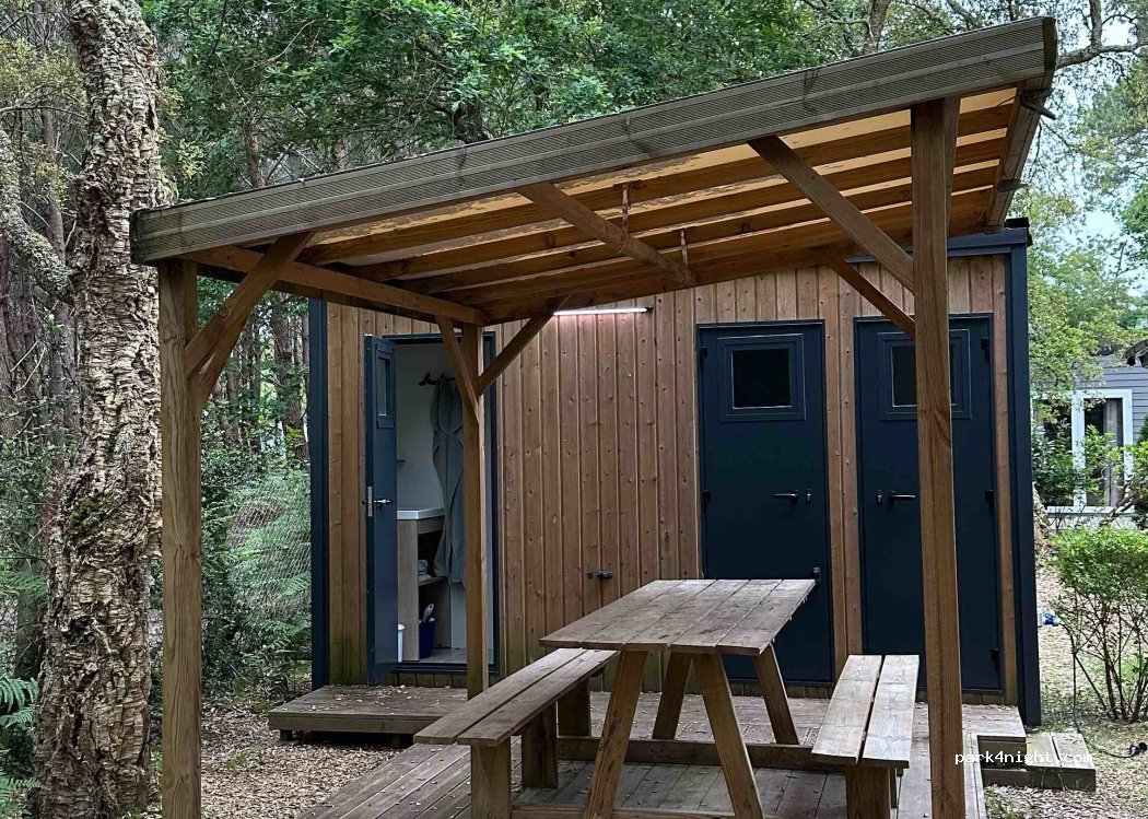 Camping under the pines. One of the few to still be open in October. Quiet, sanitary clean and very well redone some of which is even heated. Lovely staff. Heated pool. Paillotte bar very nice. Food truck while their restaurant is closed. Many barbecue available.