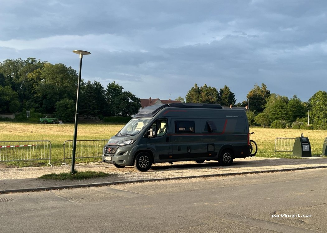 très bien situé pour des visites à vélo ou à pied, juste à côté de la voie verte le long du canal vers Orléans (5km), nous nous sommes stationné sur l espace en gravier jaune à côté des bulles à verre, plus de place que sur les emplacements de stationnement, sommes restés 2 nuits (déplacé sur un stationnement la journée), attention camion poubelle le mercredi matin vers 7h