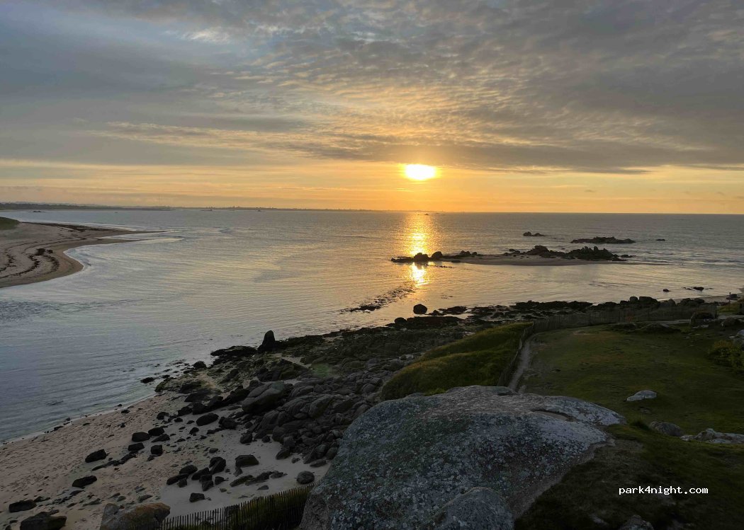 De CP is netjes en verzorgd, staanplaats camper gravel, ernaast strook gras om buiten te zitten met luifel. Nu € 13,20 per 24 uur, inclusief stroom en max. 7 dagen. Alleen gebruik van het sanistation kan ook, € 5,00 met 3 uur verblijf. Supermarkt in Plouescat op 4 km. Littoral en fietsroute ter plekke. Mooi zandstrand en inham van een meer dat bij eb droogligt. Mooie zonsondergang aan zee!!!