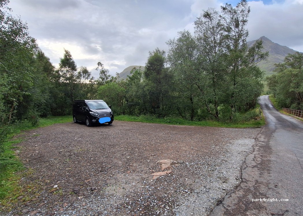 Good spot as you first enter Glen Etive from the A82. Literally 2 mins drive down it, and it’s on your left. I arrived late & the only photo I’ve added is a screen shot from a short video I took. But posted it to show you can get 2-3 vans in. Would stop again & had 4G on o2 network.