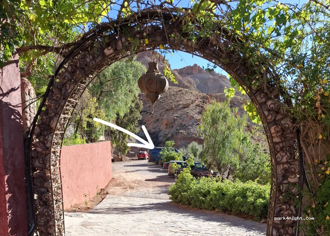 Parking de l'hôtel pour 4 campeurs mais 2cc max 6m au bout du chemin. Un bel hôtel au milieu de la Vallée des Roses. Situé sur une colline, il offre une vue imprenable pendant le dîner et le petit-déjeuner. L'endroit est parfait pour les personnes qui aiment profiter du silence et de la beauté de la nature. Ils organisent des activités culturelles et actives dans et autour de la belle vallée. D'une promenade dans la vallée à des excursions à vélo, des trekkings et bien d'autres.