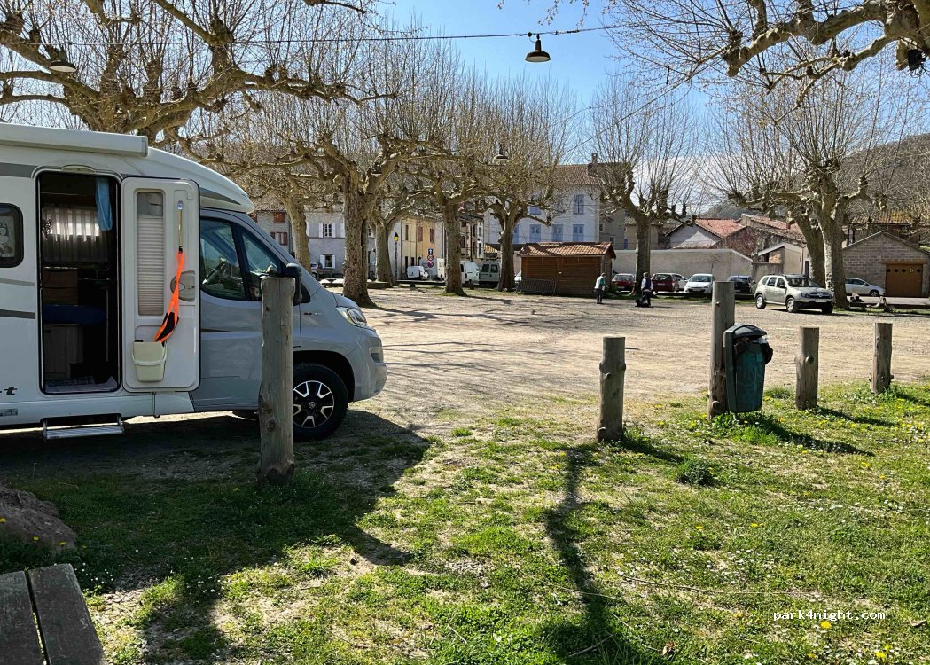 Parking toléré (voir photo) en bordure du terrain de boules, limité à 48h. Calme la nuit, bruyant dès 6h.