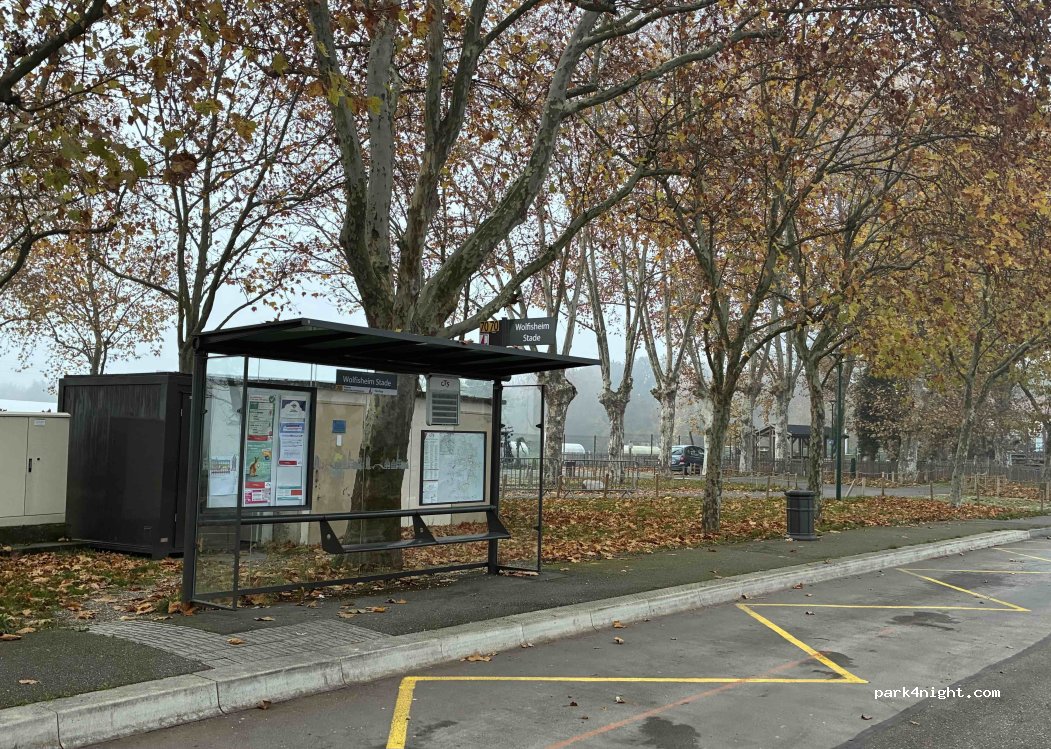 Parking gratuit du stade de football. À proximité immédiate de l'arrêt de bus et de la piste cyclable. Stationnement autorisé la nuit, mais isolé. Possibilité de rejoindre Strasbourg à vélo par la piste cyclable longeant le canal.