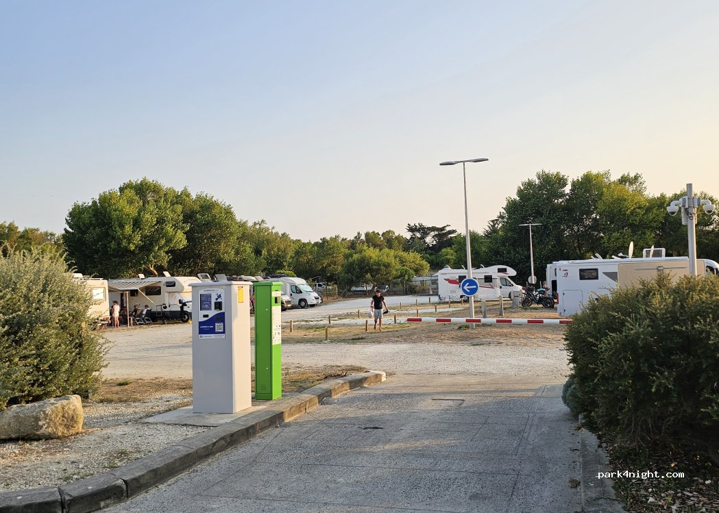 Aire très agréable, 12 euros les 24h, 20 euros les 48h, eau + électricité inclus. Beaucoup de places, proche en vélo du phare de la Baleine et de la plage. Je recommande, très calme