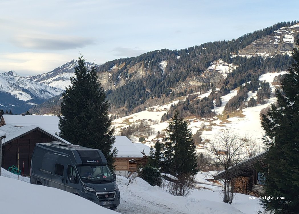 Petit parking au calme parfait pour passer une nuit, belle vue sur les montagnes et sur Megève.