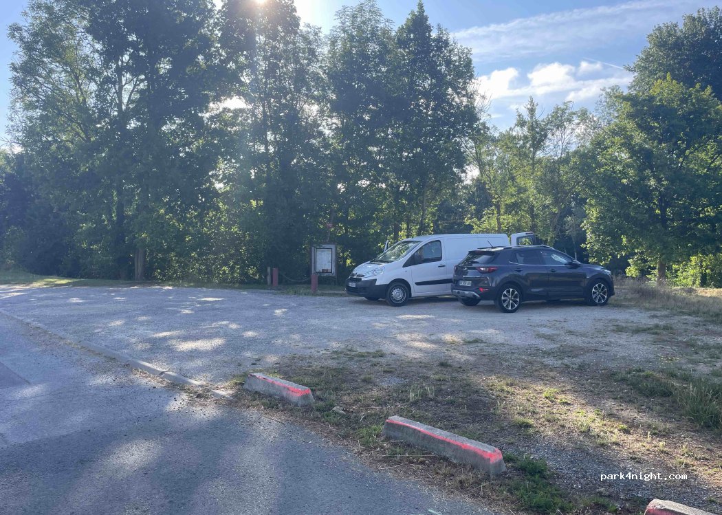 je confirme, 1 er parking en bord de route, 2 ou 3 places en se serrant, mais le garde champêtre nous a proposé de passer la chaîne et de se garer sur la partie en bord d étang, en fait, ancien terrain de pétanque, donc herbe mais pas d enlisement. super spot...