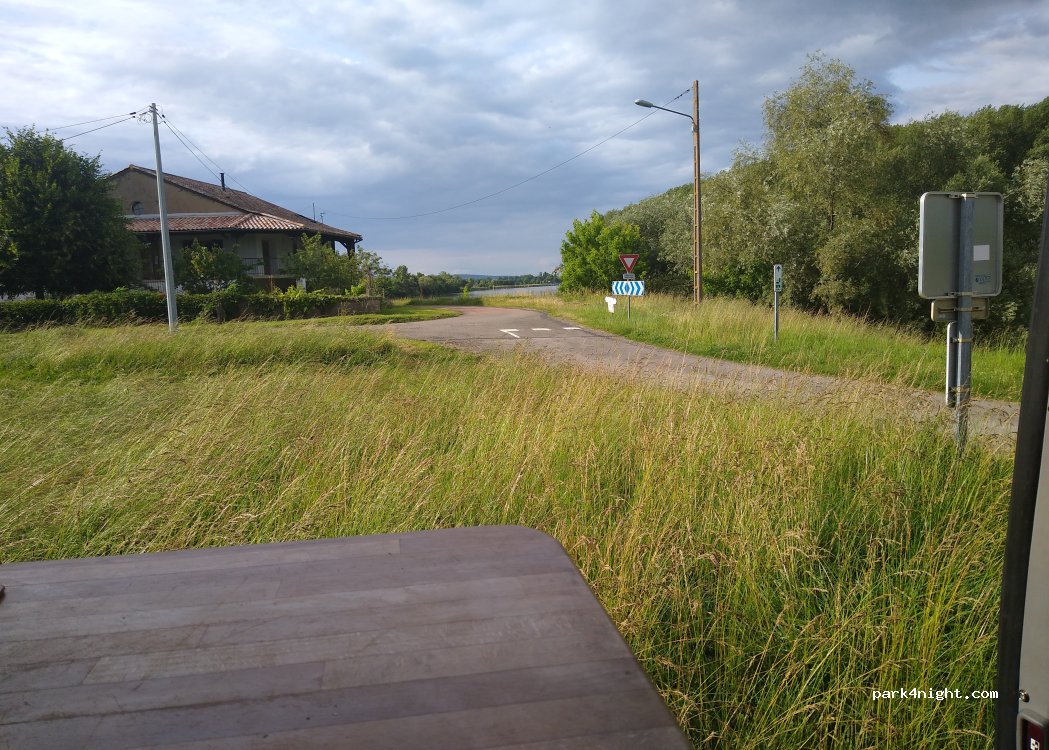 Lovely spot on banks of Saone river. Easy access from motorway. Small car park, no services. Next to a cycle path and close to fishing lake. There were 4 motorhomes there when we were on Easter Saturday so might get busy high season. Only room for 6 units probs. Locals also use parking during day
