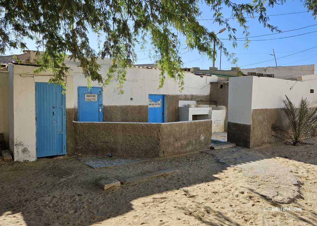 Behind a small blue gate in the corner of a square: A small, enclosed, secure campsite (also a motel) with pitches for approximately 5 motorhomes. Good Wi-Fi. Basic sanitary facilities with buckets; showers are okay. Toilet emptying point. Helpful, friendly owner.