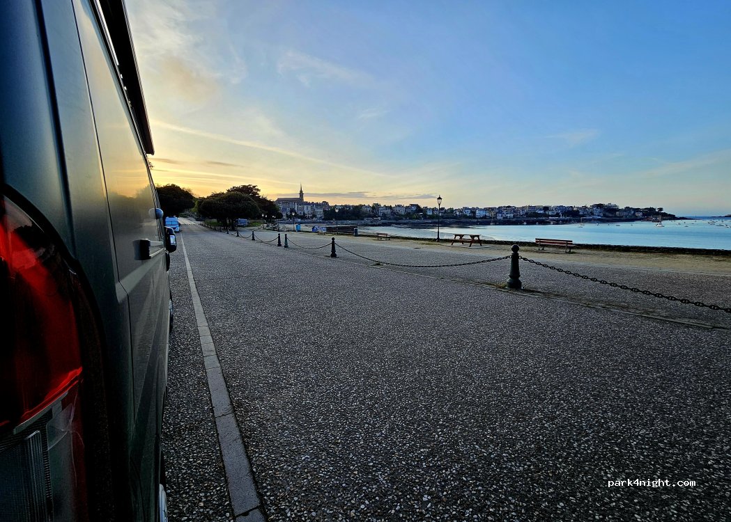 Pas de soucis pour stationner avec notre cc de 7 m 20 à 6 h du matin. En face de la plage. Donc les voitures stationnent la journée. Belle vue sur saint Malo. Sinon grande circulation et parfois à grande vitesse