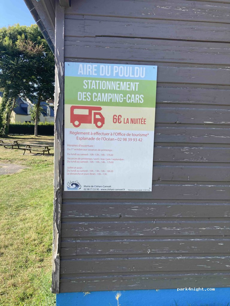 Très bon endroit à 200 m de la mer a côté des tennis au Pouldu, pas de service. 5.50 € le matin par police municipal. 10 places.