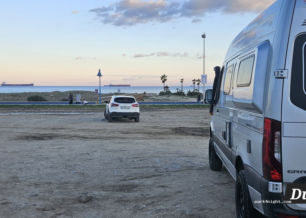 Al lado del paseo, mucho coche entrando y saliendo incluso de madrugada hubo botellón, para una noche está bien después de haber disfrutado de la playa para más días no lo recomiendo, no hay sombra ni puedes sacar nada