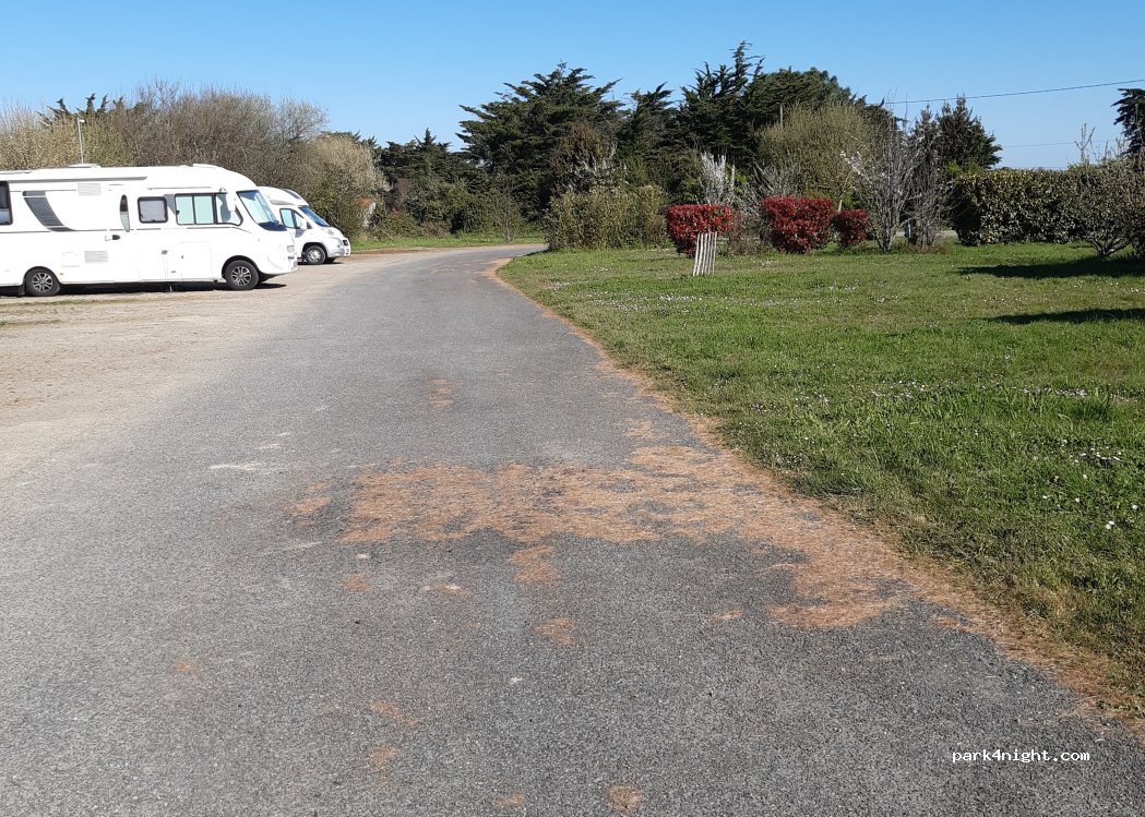 Aire agréable, emplacements délimités. Possibilité d'utiliser la piscine (1,5€/pers) et les douches (2€/7 min d'eau chaude) du camping. A 25 min de la Pointe Gildas. Belle balade au bord des falaises.