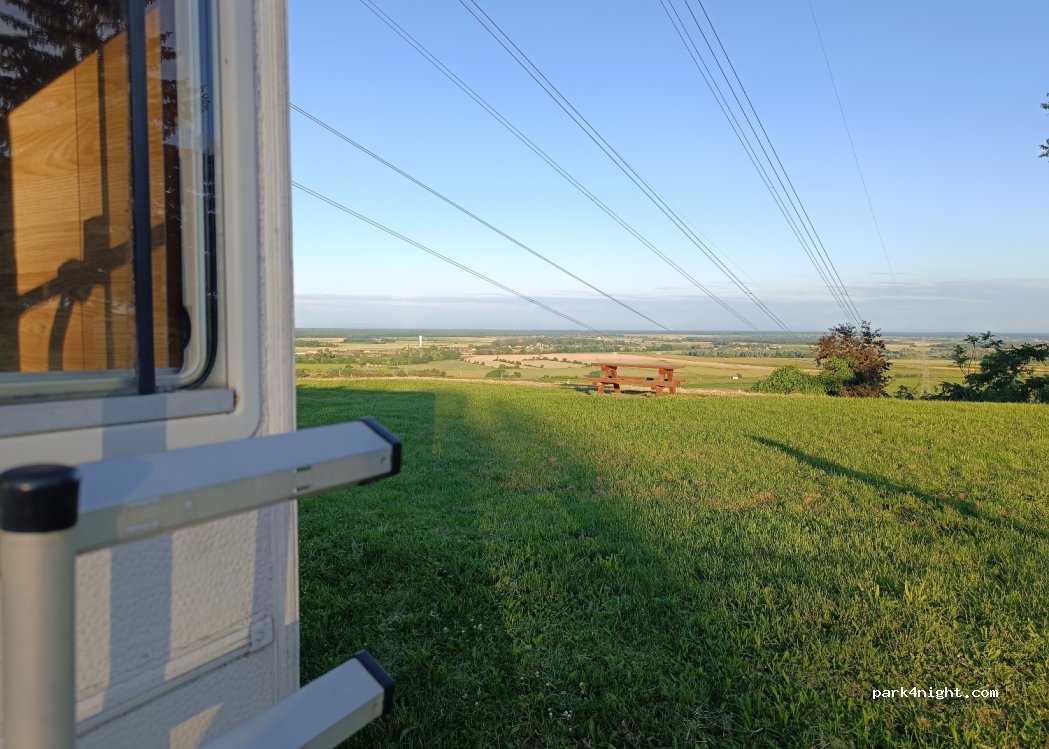 Le long de la route mais très peu de circulation la nuit, place pour plusieurs camping car. Belle vue dégagée, plusieurs bancs de pique-nique. Idéal pour manger et dormir. Mort immédiate pour les personnes qui craignent les champs magnétique car ligne à haute tension, sinon pas de problèmes. Pas de grâce matinée après 10h car tir sportif dans l'ancienne carrière en face.
