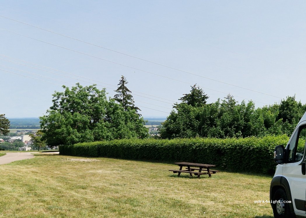 Picnic area perfect. Benches and lovely views over the fields and vines. Stayed here rather then the next area as it's hard standing and flat. Next area is grass and slopes. No facilities so use proper campingcar service area in the village if needed.
