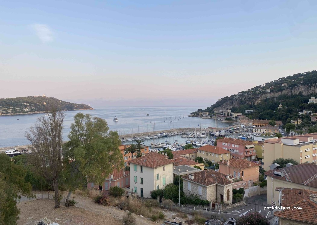 Hemos dormido aquí 3 noches, las vistas son preciosas! Villafrance-sur-mer queda a 10 minutos caminando y sin duda el paseo entre la muralla y el mar es algo que disfrutarás. El parking es bastante transcurrido pero muy seguro. Al final del parking hay una fuerte de agua con buena presión para repostar, nosotros en 15 minutos hemos llenado un tanque de 134lts