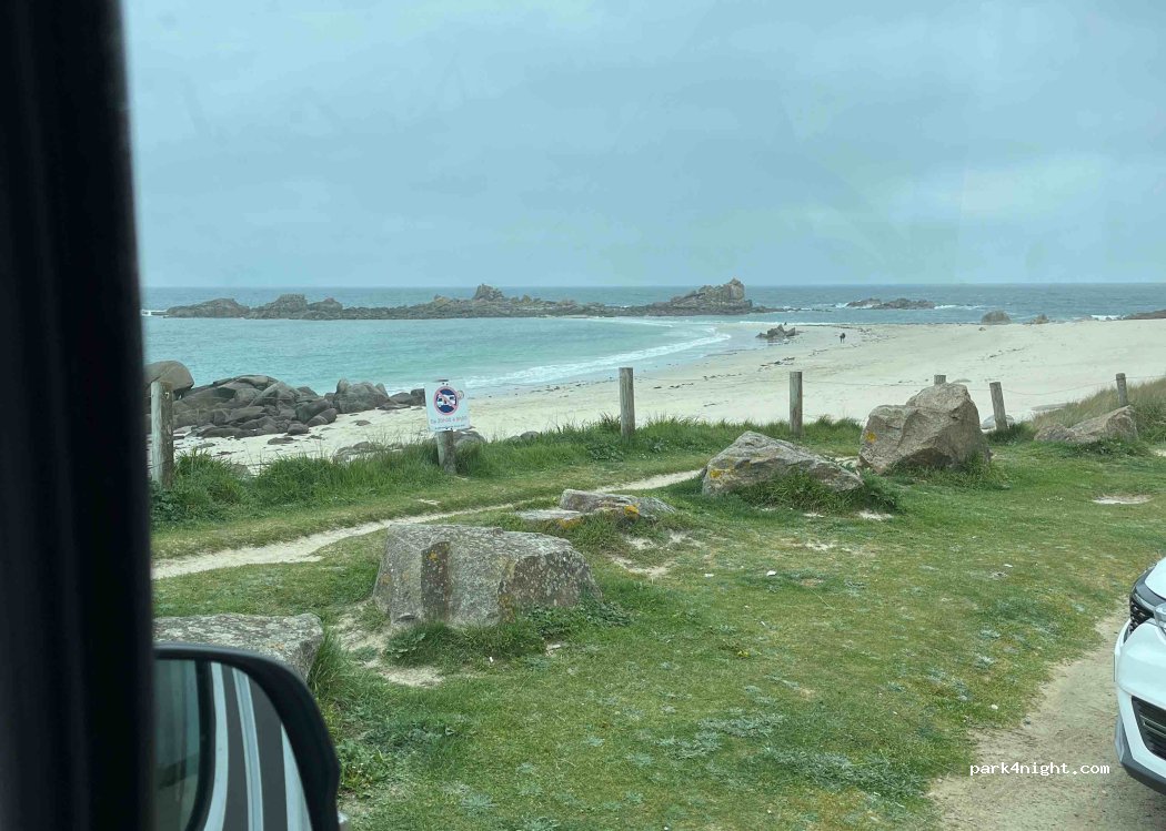 Parking en sable qui donne sur l’une des plus belle plage de Bretagne. Douche de plage disponible en bonus.