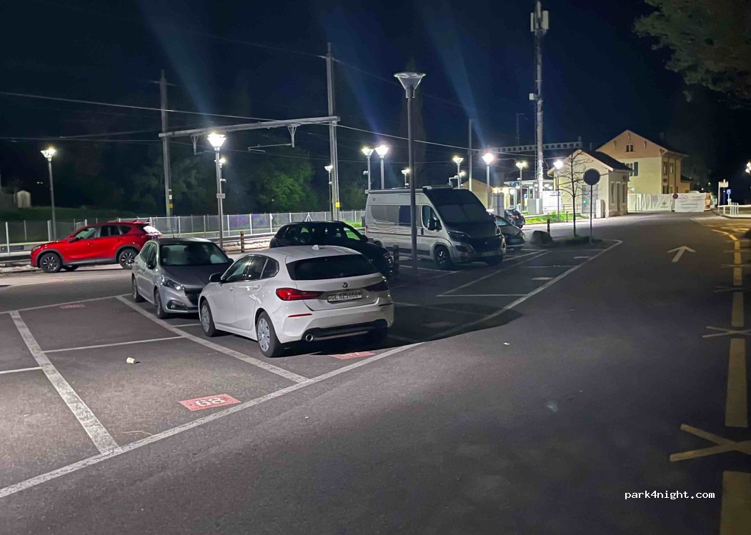 Perfecte plaats. Hier in ieder geval 1 nacht verbleven én voor 3CF rijd je in 10 minuten naar Cornavin. je betaalt 7CF voor 24 uur parkeren en dat mag uiterlijk 7 dagen. nu, in het weekend, is er plaats genoeg. geen hoogtebeperking en wij staan op 2 parkeerplaatsen. WC van het station kost 1 euro en ziet er schoon uit. en ja, je hoort de treinen elk half uur maar vonden wij niet zo storend.