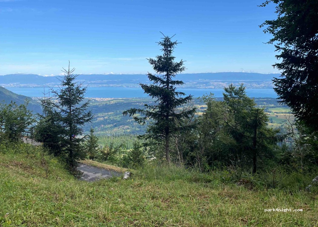 Belle aire de stationnement pour une nuit ou plus. A proximité immédiate du belvédère. Quelle vue, magnifique coucher de soleil sur le lac Léman Plusieurs tables de pique nique avec vue ! 1km plus loin une fromagerie chèvre et lait, elle fait également petit resto. Possibilité d'y acheter pains et fromage. De nombreuses balades autour.