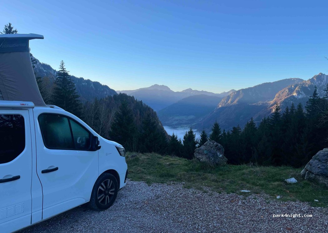 Au sommet d'un col, parking avec toilettes sèches le long de la route peu empruntée au printemps avec un panorama sur la vallée. Calme et verdure, nuit et barbecue possible. Des randonnées incroyables commencent à partir d'ici. Restaurant à 10 minutes à pied jusqu'au bout de la route avec une vue imprenable. Le menu sonnait bien mais pas ouvert début septembre. Ouvert uniquement en haute saison - pas sûr de l'hiver.