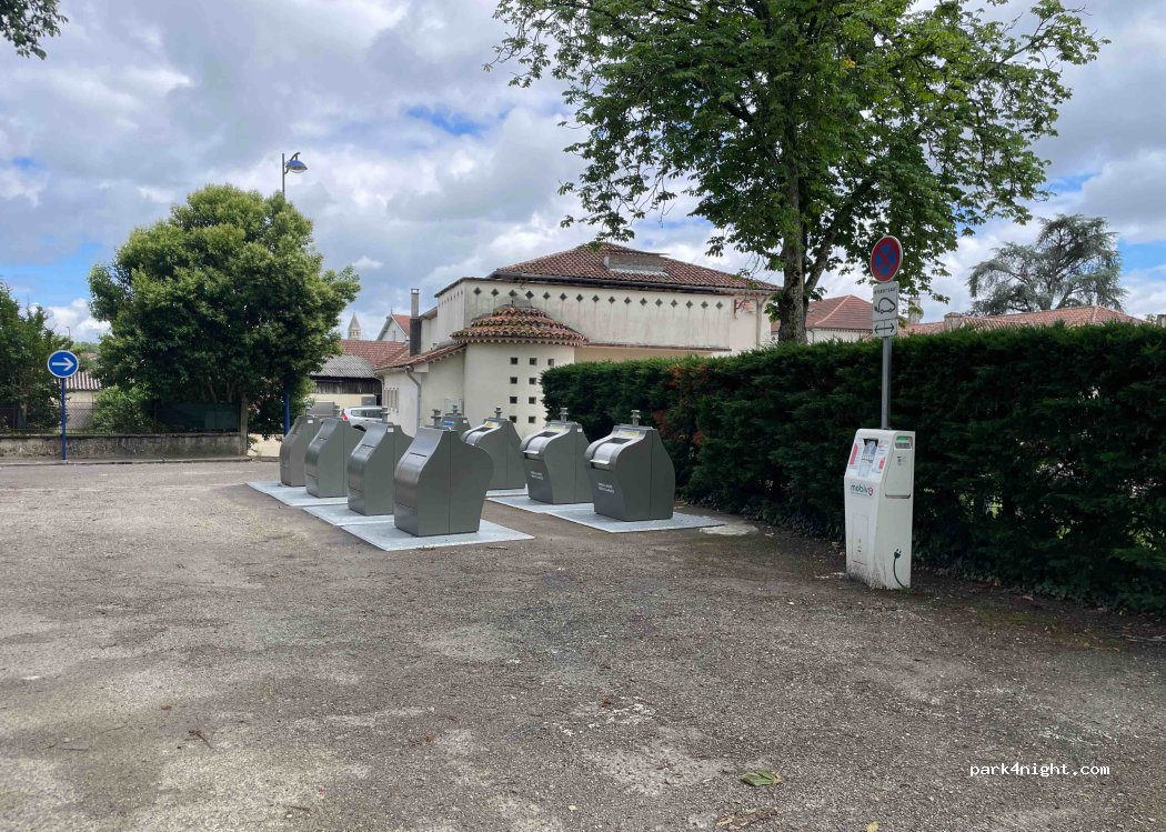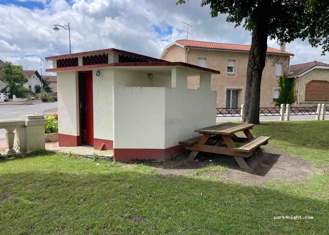 Petit parking ombragé face aux arènes. Possibilité d'y passer la nuit, route très peu passante. Toilettes publiques et robinet d'eau à disposition. A proximité d'une excellente petite pizzeria où tout est fait maison que je recommande.