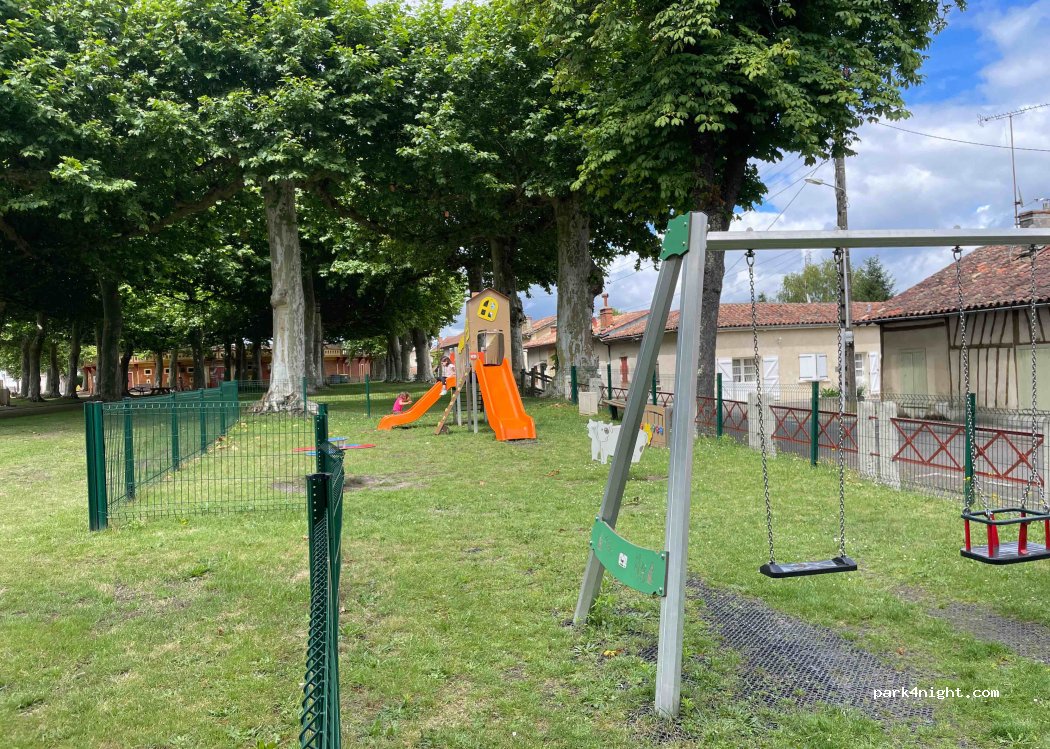 Small shaded parking facing the bullring. Possibility of spending the night, road very little passing. Public toilet and water tap available. Close to an excellent little pizzeria where everything is homemade that I recommend.