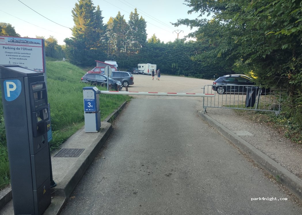 Aire chemin de l'Olivet, pratique, près de la cité médiévale, pain au feu de bois, miam, entrée du parking avec barrière paiement 2€ en espèce ou par CB. Merci à la municipalité