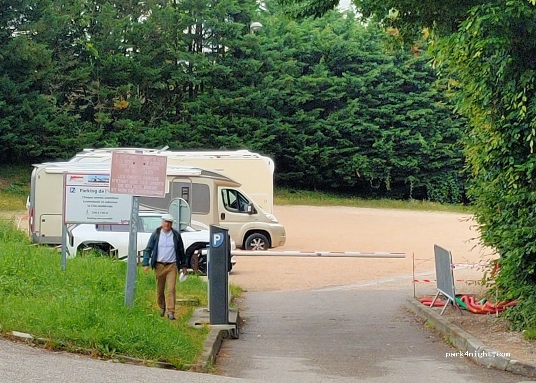 Not ideal for big vans, but it was OK. Barrier entry, vehicle plate registration (Read our 1's as i's). 5 minute walk to medieval city of Perouges, well worth a stop. You pay at ticket machines outside tourist information. It's 50 cents every 15 minutes, with a maximum charge of €6 between 0900 - 1730, then it's free 1730 to midnight, and then another €6 charge from midnight to 0900....