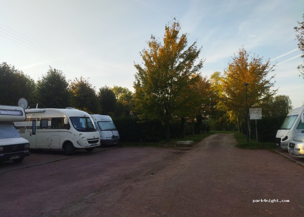 Possibilité de se garer sur le trottoir en bataille avant les 8 emplacements prévus en herbe s'ils sont un peu trop humides... Seuls les services sont payants (borne eau électricité). Très beau environnement, encerclé par la rivière Eure, parcours santé. Jolie région et à une centaine de km seulement de Paris. Merci de mettre à disposition des camping-cars, un tel emplacement.