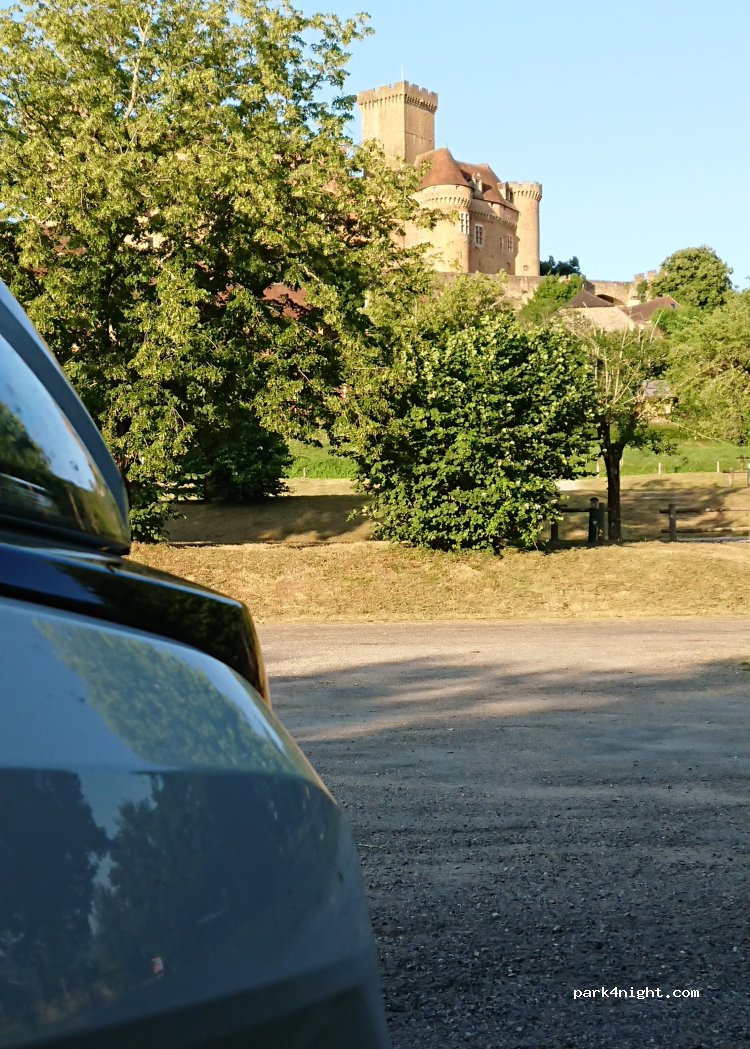 parking payant à 3 euros la nuit avec jolie vue sur le château, calme la nuit avec le restaurant au pied du château , quelques allées et venues des voitures au restaurant le soir.