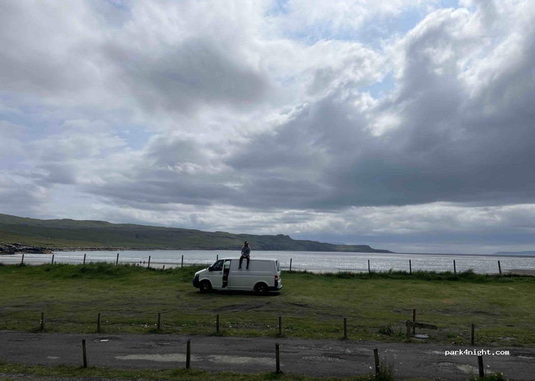 Buen sitio en una zona muerta sin carretera de salida, es decir, hay que deshacer camino. Cuidado porqué en zonas de agua la isla de Skye es un hervidero de mosquitos. Todos los servicios, muchas plazas diseminadas para ponerse donde apetezca, una bonita bahía y unas montañas preciosas. Precio rondando los 30 €, algo caro para tres personas y furgoneta. Noche del 05/09/22.