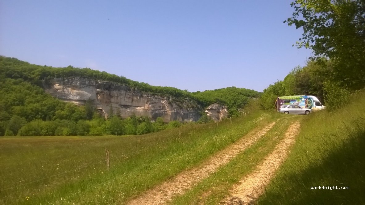 Une vue magnifique sur la falaise du Grand Roc. De la place pour un véhicule (prévoir les cales, le terrain n'est pas plat) La proximité avec la ligne de train et la station d'épuration apporte peu de nuisance (pas de circulation de nuit et juste l'oxygénation qui se déclenche de temps en temps pendant une durée courte). La propriétaire du centre équestre nous a indiqué que nous ne gênions pas.