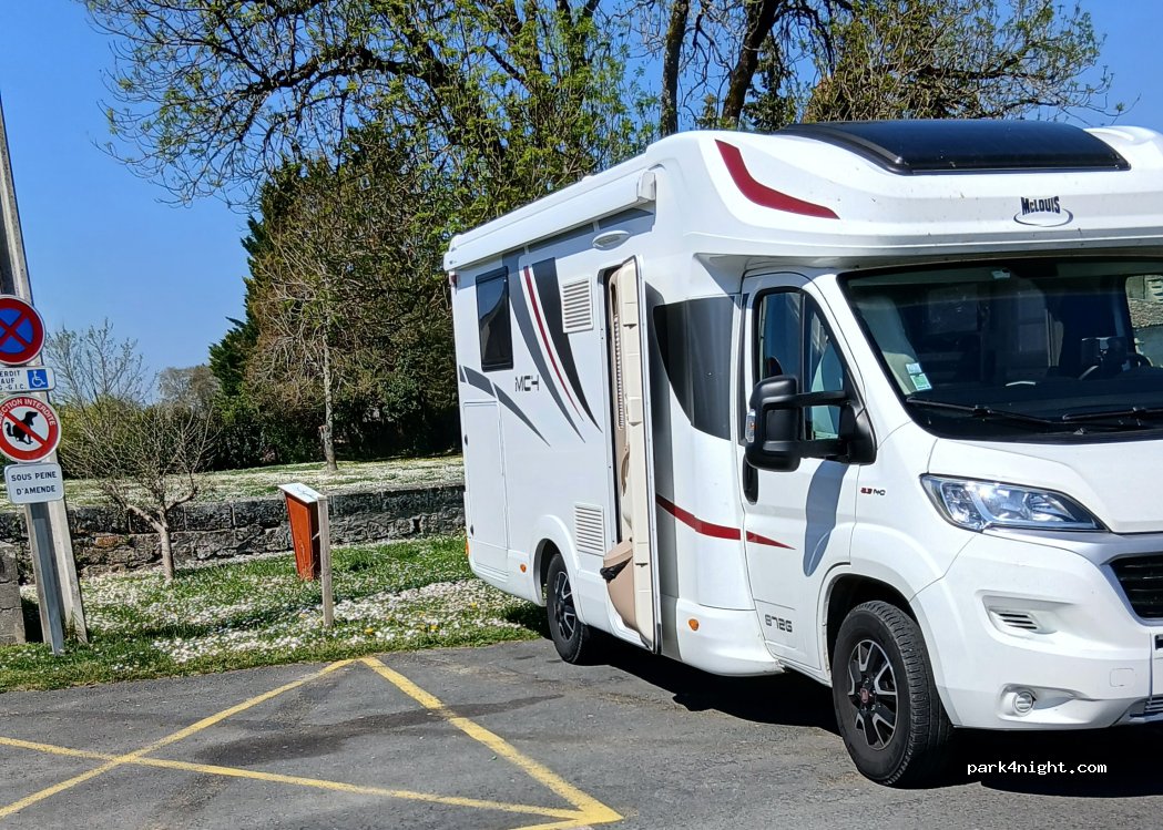 Grand parking à côté de l église sans barre de hauteur au milieu du bourg. A déconseiller toutefois le dimanche matin si vous ne voulez pas être réveillé par l installation du marché. Une boulangerie à 2 min à pied et un restaurant.