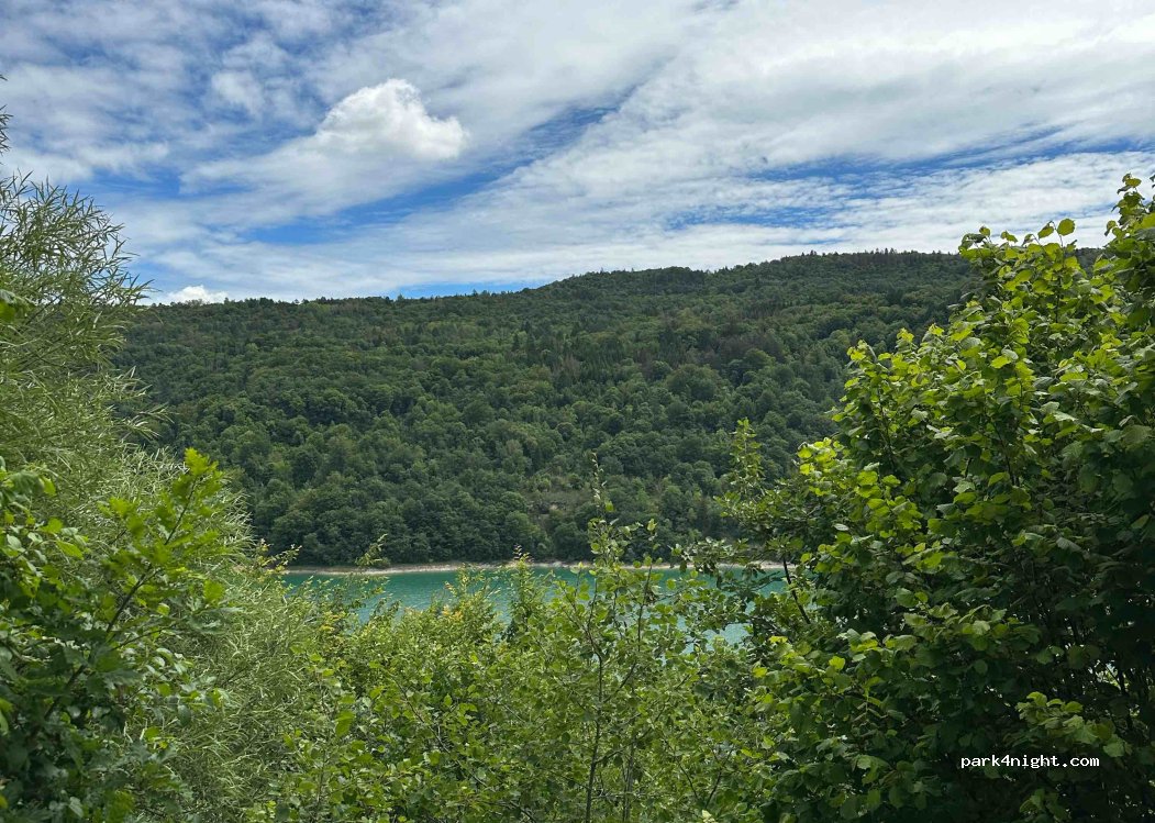 Parking en pleine nature à 5min à pieds du barrage de Vouglans. Lieu tres calme avec une jolie vue sur le Lac, où nous avons passé une nuit. Un van était garé à côté. Pas de services.